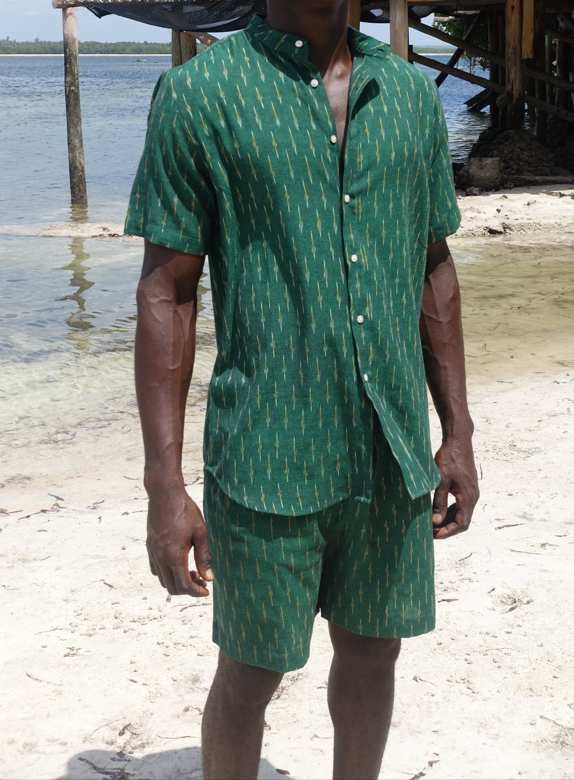 • Set Components: short-sleeve shirt with a korean collar and matching Bermuda shorts